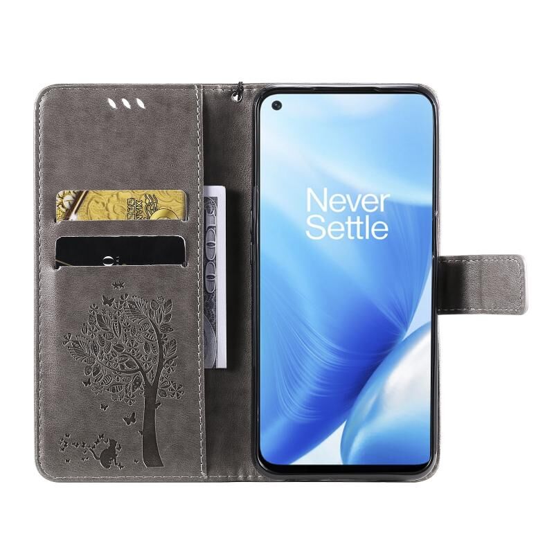 Θήκη δερματίνης PU με σχέδιο δέντρου & γάτας, εκτύπωση με θερμοτύπηση, οριζόντια αναστροφή, με βάση στήριξης & θήκες καρτών & πορτοφόλι & κορδόνι για OnePlus N200 5G (Πράσινο)