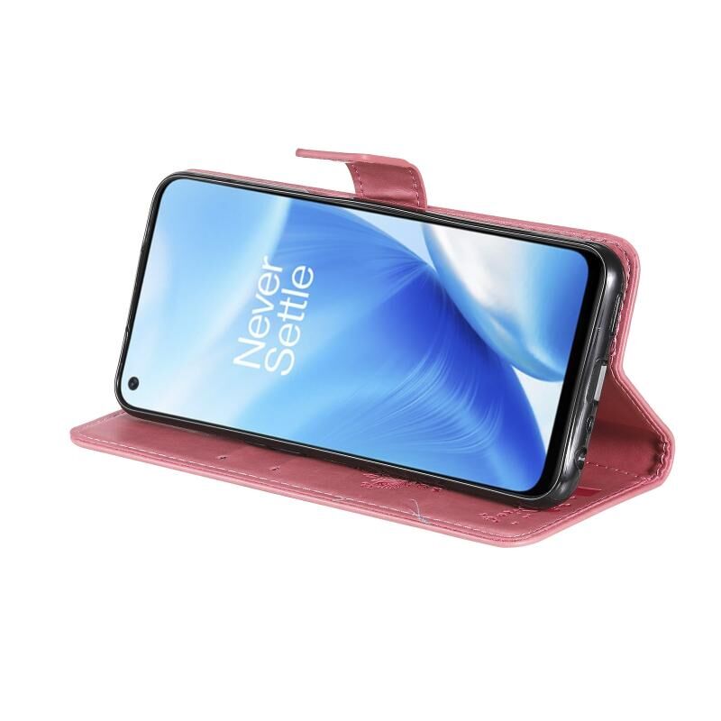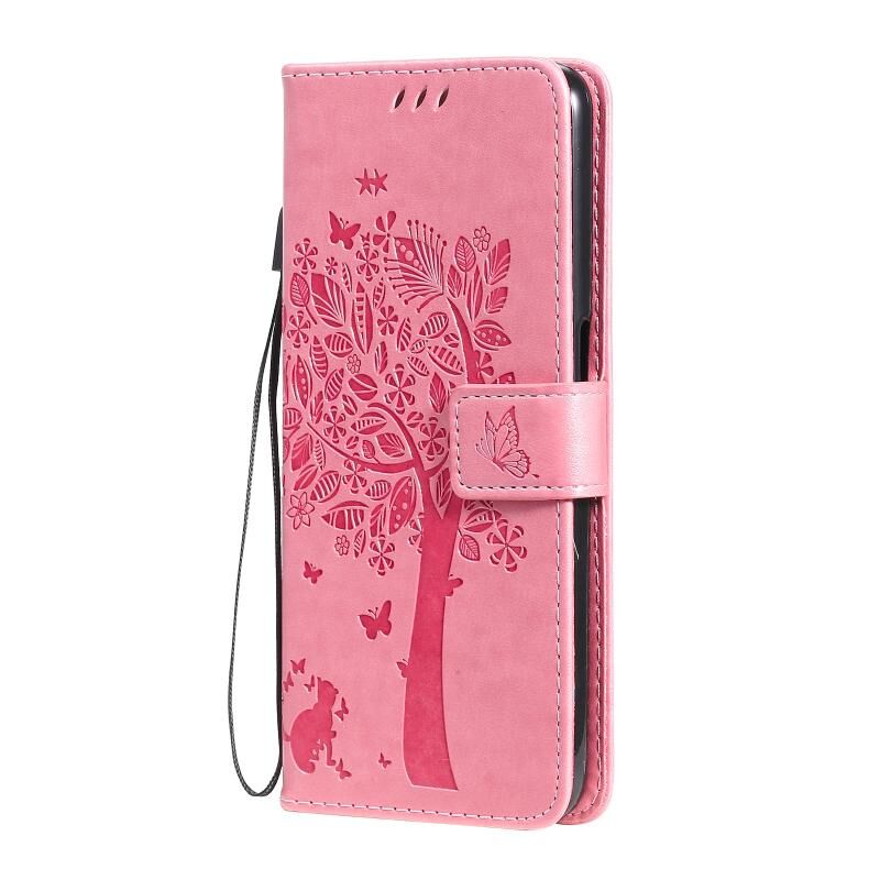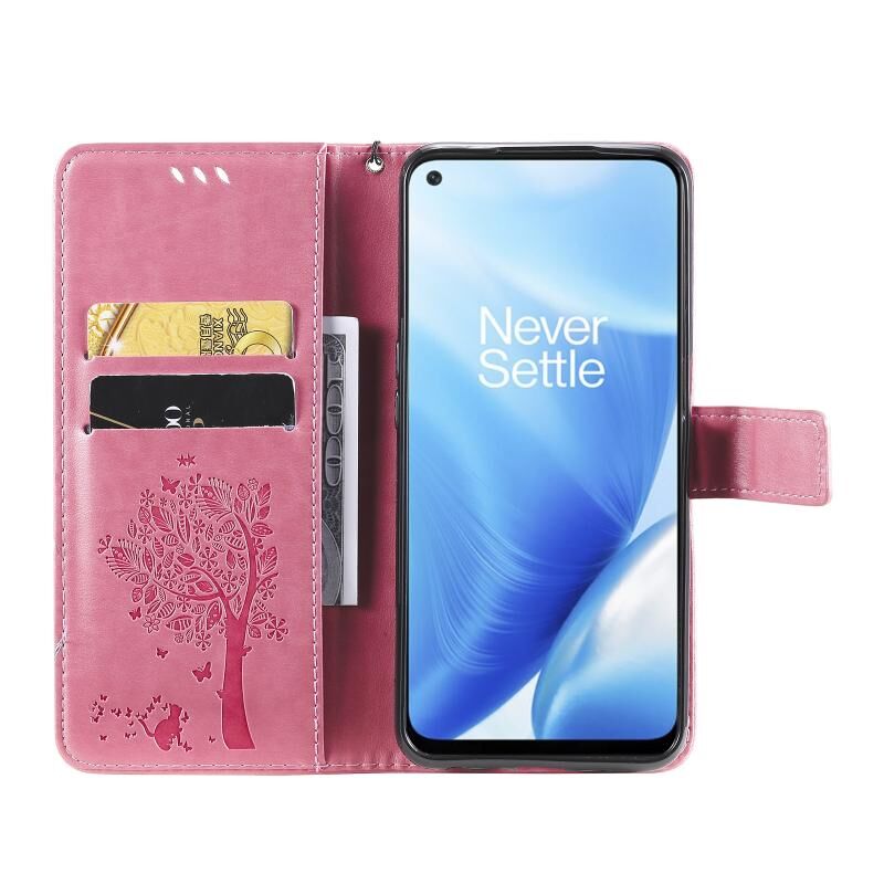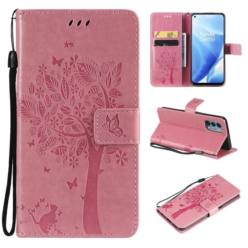 Θήκη δερματίνης PU με σχέδιο δέντρου & γάτας, εκτύπωση με θερμοτύπηση, οριζόντια αναστροφή, με βάση στήριξης & θήκες καρτών & πορτοφόλι & κορδόνι για OnePlus N200 5G (Πράσινο)