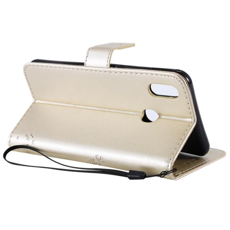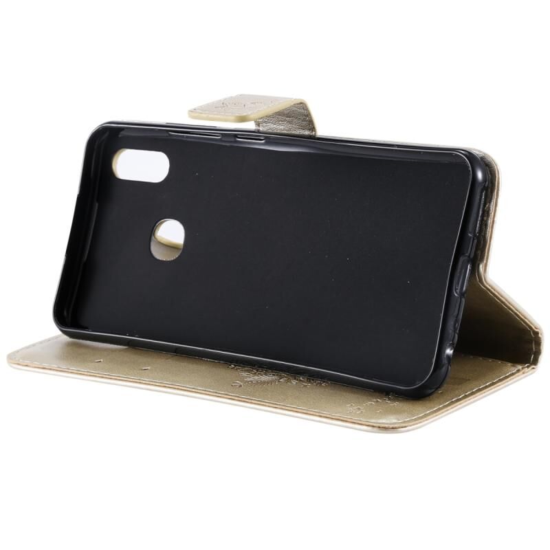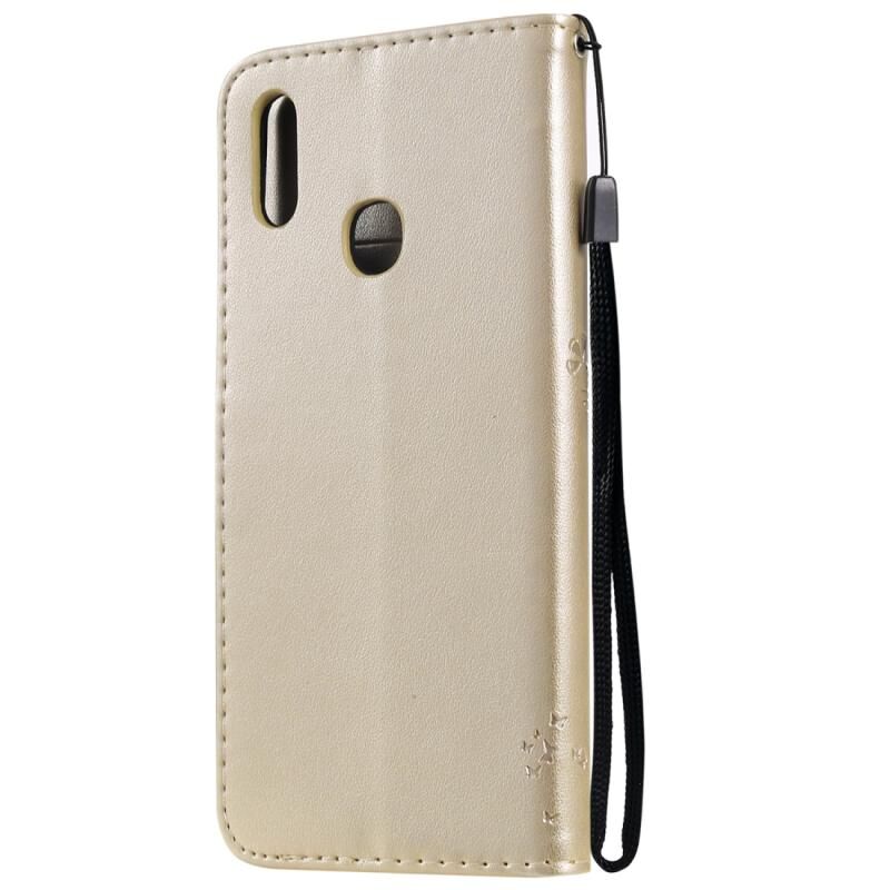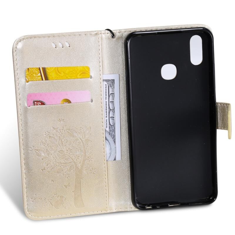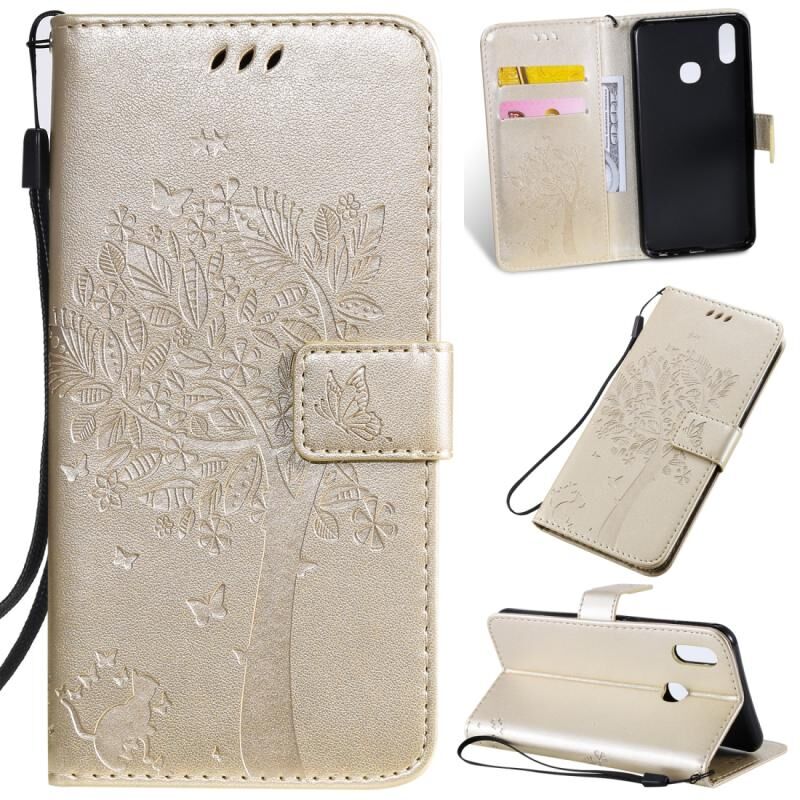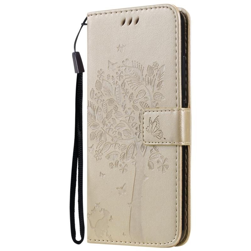Θήκη δερμάτινη PU με σχέδιο δέντρου & γάτας, με εκτύπωση, οριζόντιο άνοιγμα, με βάση, θήκες καρτών, πορτοφόλι & λουρί για Vivo Y93 / Y91 / Y95 (Χρυσός)