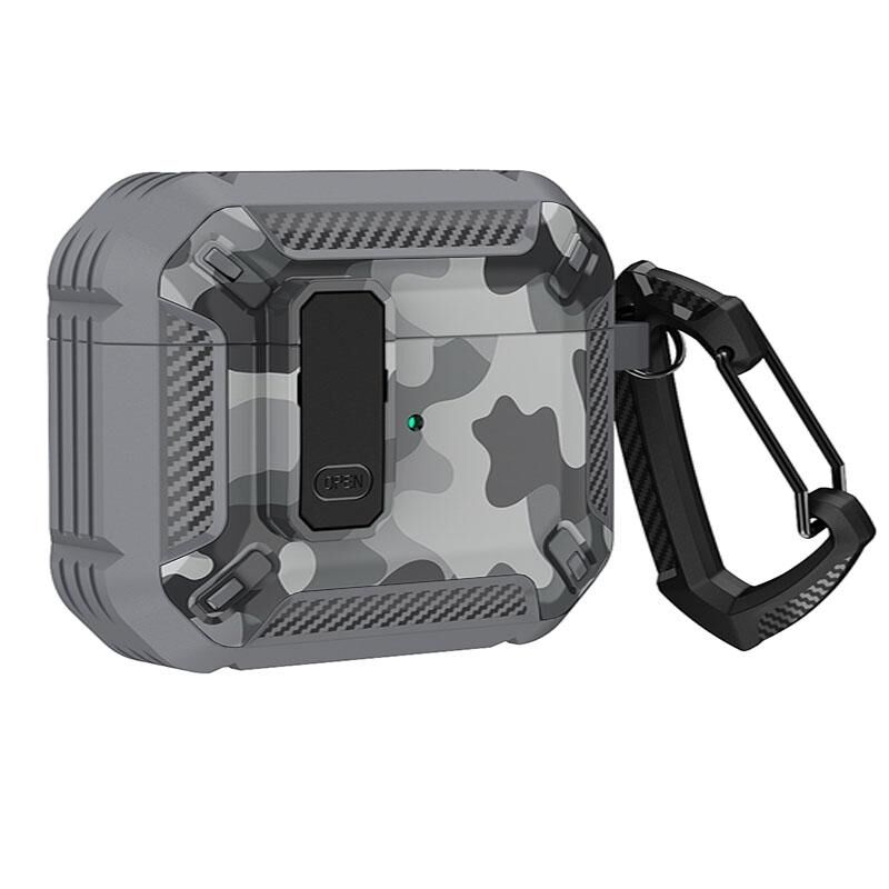 Θήκη ακουστικών με εκτύπωση δύο χρωμάτων, κλείδωμα με διακόπτη & γάντζο για AirPods 3 (Μαύρο + Καμουφλάζ Γκρι)