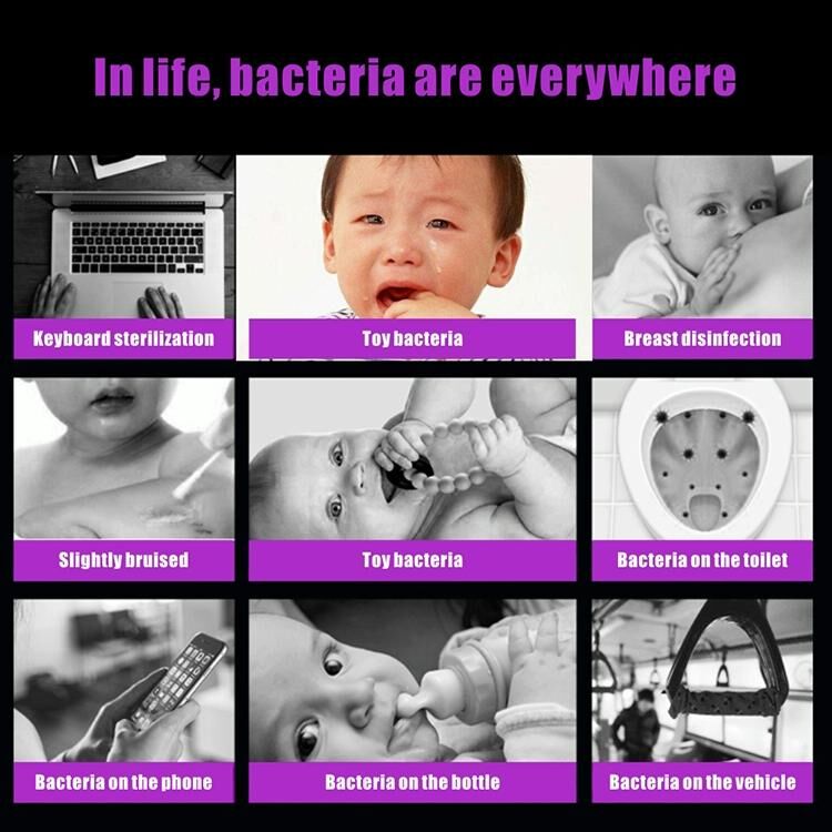 1. Scientifically proven disinfection: Disinfetion light emits strong UV radiation which will in seconds kill 99.99% germs hidden in crevices or corners where cleaning wipes canot reach