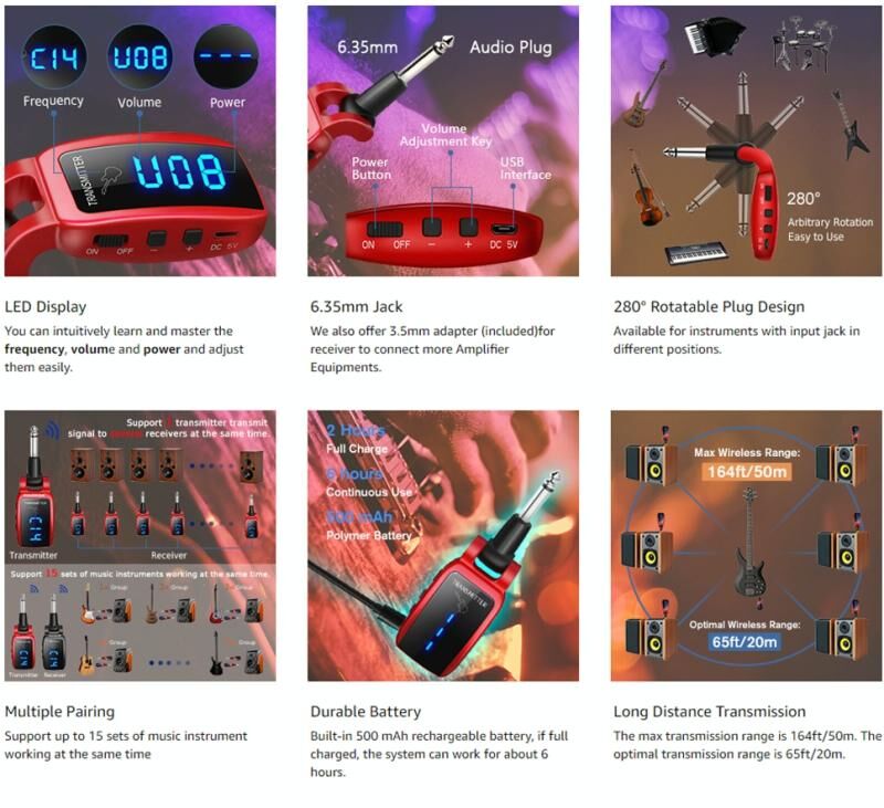 Ασύρματος πομπός/δέκτης κιθάρας U12DX 6.35mm Jack, επαναφορτιζόμενος αντάπτορας (Μαύρο)