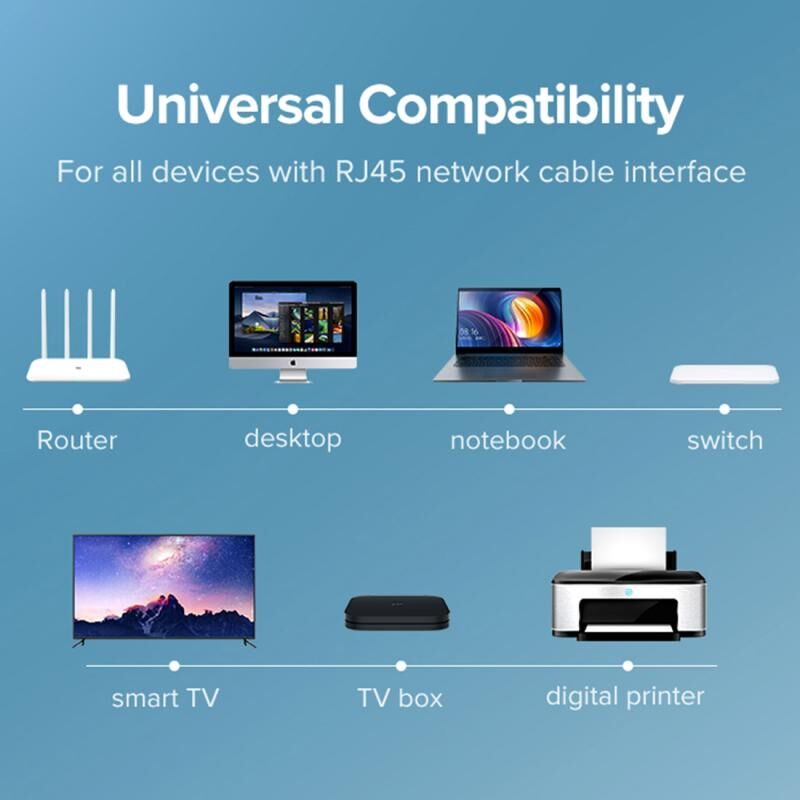7. Universal RJ45 network cable interface, suitable for all kinds of network equipment, such as: desktop computers, notebook computers, routers, TV boxes, etc.