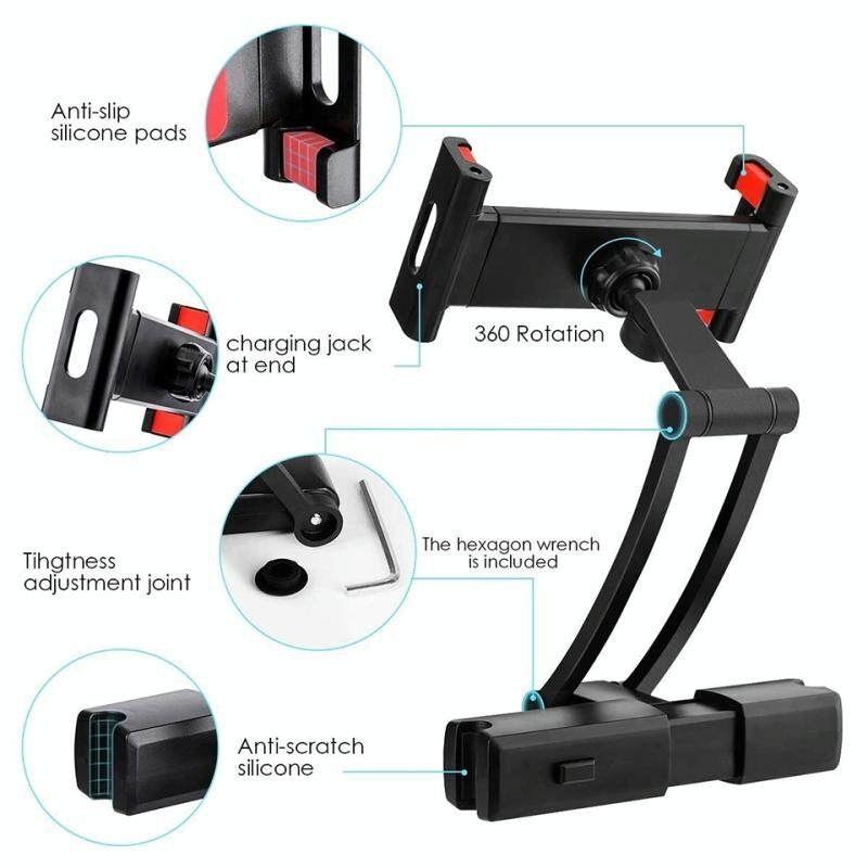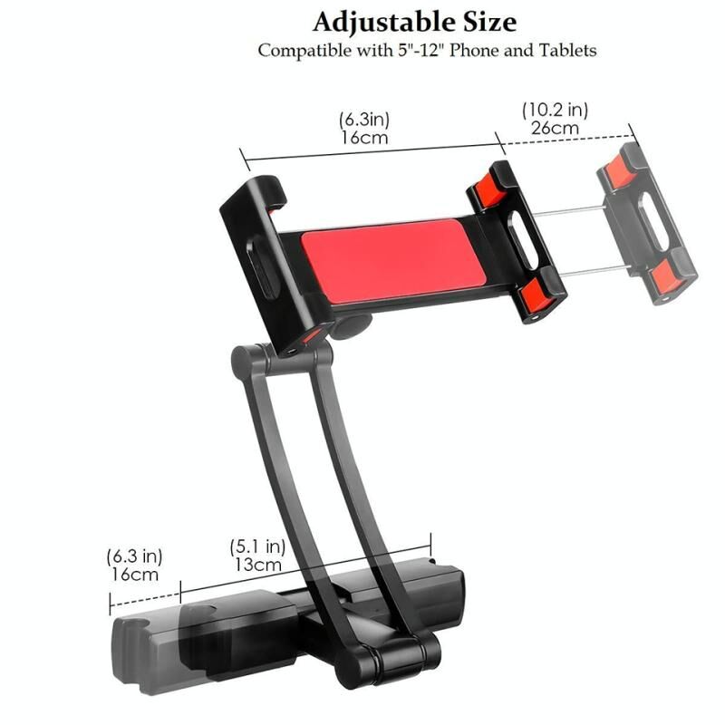 1.Car Headrest Mount for kids works with all 5- 12.9Inch devices, such as new iPad 2017 Pro 9.7, 10.5, Air mini 2 / 3 / 4, Samsung Tab, E-reader, Kindle fire, Nintendo Switch, DVD Player, Surface,iPhone X / 8 / 7 / 6 Plus and Tablets.