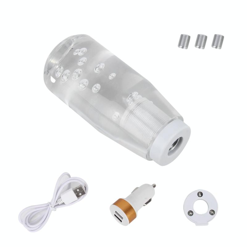 4. Package includes: 1*Universal 10cm LED Shift Knob, 1*Charging Cable, 1*Dual USB charger, 3*Adapter.
