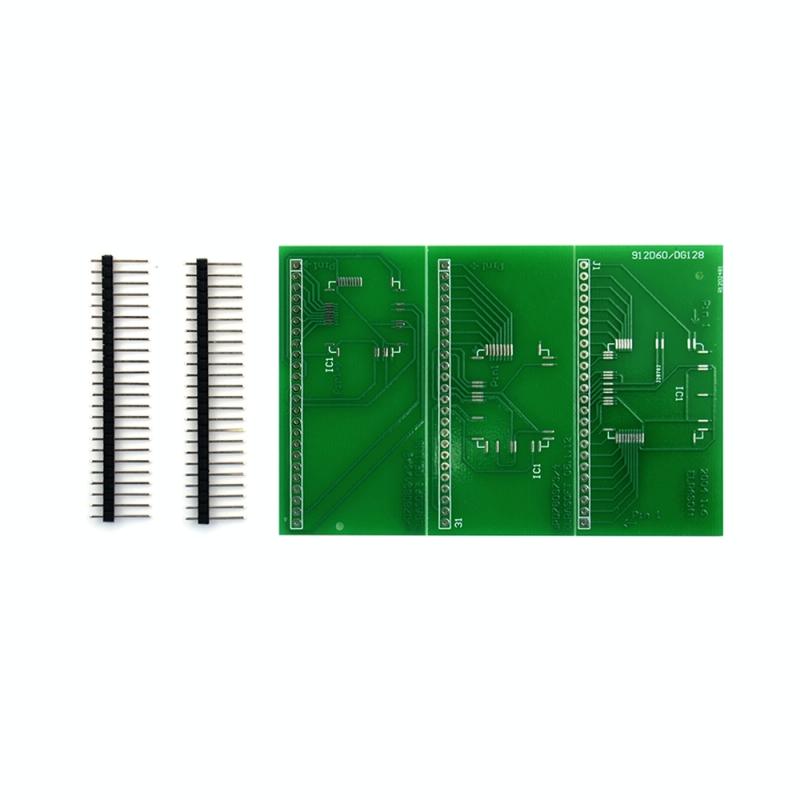 4. M-otorola MCUs: Pick the Adapter you want to use, attach the flat cable to the Adapter (PIN1 is always indicated, on both the cable and also the Adapter) and also to the 10pin ISP connector of main board. Select the VCC supply source by the jumper on the mainboard next to the ISP connector (on = target supplied from upa, off = target got own supply). Slide the Adapter over the soldered PLCC MCU on the target PCB. (No soldering, no pinout reviewing, no pin counting, saves lots of time and hassle and let you make your job faster, precise and easier)