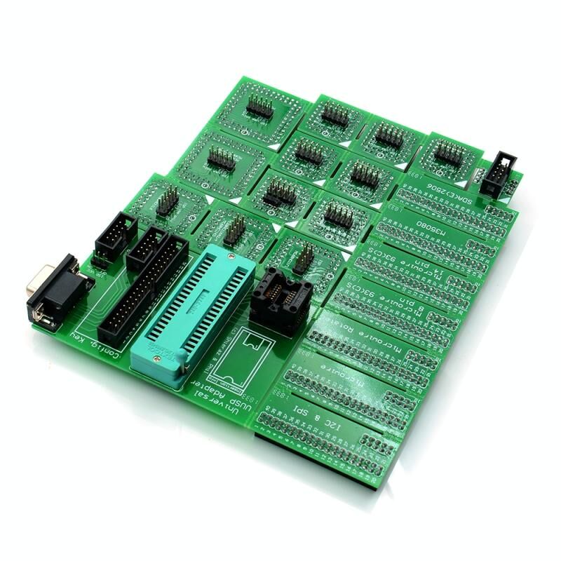 3. EEproms: Simply connect the mainboard to the UPA programmer directly or by using a DB9 male / female extension cable (1:1). Insert the correct config key into the slot of the mainboard and start programming either via the ZIF or SOIC Socket. You can also use the included DIL to 10pin F-lat-ribbon header, put it inside the ZIF socket and wire up an SOIC clip or clamps for ISP use from there.