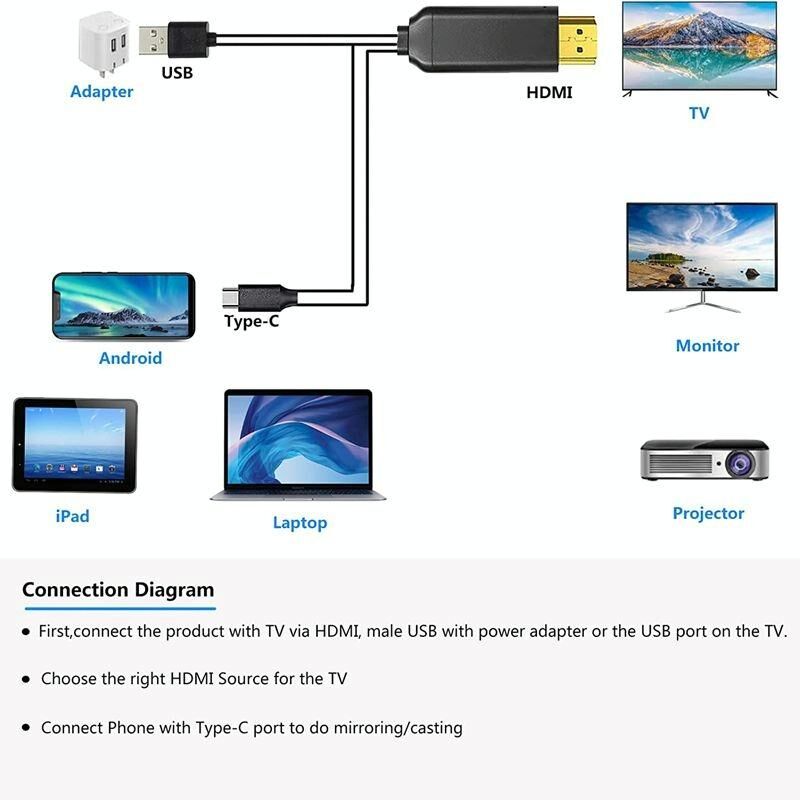 4.Phone to TV Adapter - Συνδέστε το καλώδιο 6FT longt USB σε έναν προσαρμογέα ρεύματος (5V@2A) για να τροφοδοτήσετε τον υπολογιστή/τον υπολογιστή/το τηλέφωνό σας εάν δεν υπάρχει ρεύμα. Είναι εξαιρετική λύση της μη παροχής ρεύματος όταν εργάζεστε στο γραφείο, παίζετε παιχνίδι, παρακολουθείτε ταινίες. Επίσης, το καλώδιο USB σε καλώδιο τύπου C μπορεί να χρησιμοποιηθεί ως κανονικό καλώδιο φόρτισης μόλις δεν χρειάζεται να συνδεθεί σε συσκευές με θύρα HDMI. Πλήρως αναστρέψιμη διεπαφή USB-C, και υποδοχή HDMI για την παροχή μέγιστης αγωγιμότητας και τη βελτίωση της μετάδοσης σήματος.