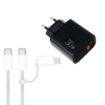PD31 30W USB-C / Type-C + USB-A Charger with Type-C+8 Pin 2-in-1 Data Cable, EU Plug(Black)
