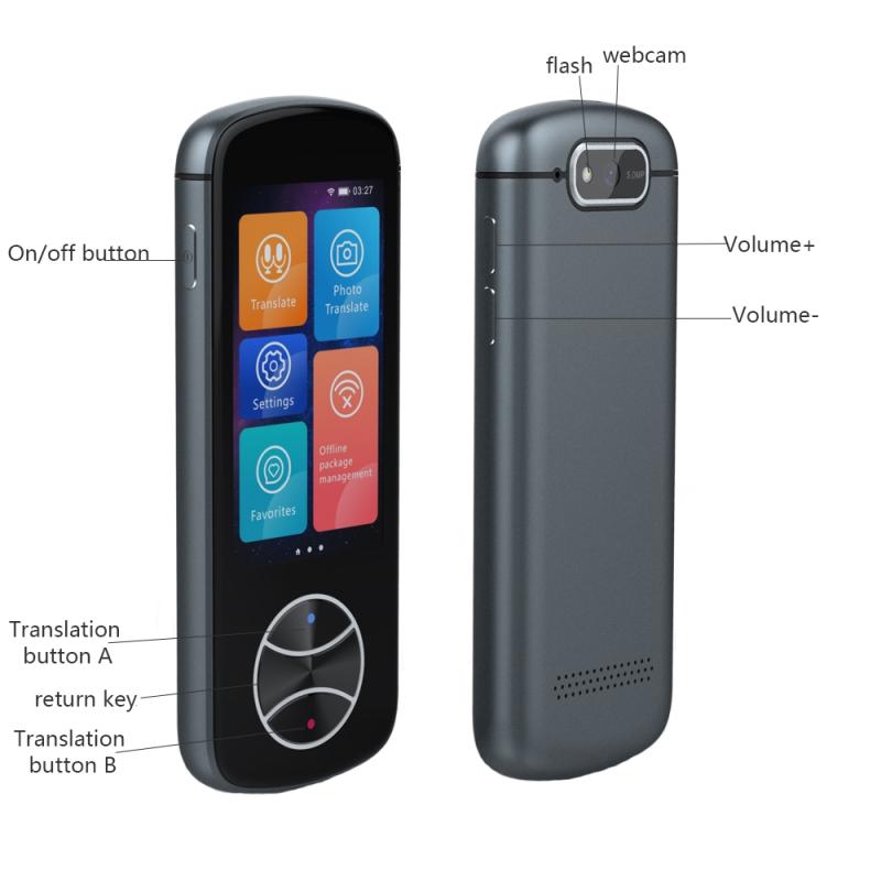 3.with 5 million pixel camera and OCR (character recognition), 3.0-inch high-definition touch screen, when converting voice through audio, the apparatus stops translate speech can convert it to text on the screen. The response time of the instant voice translator is less than 0.5 seconds (faster than the human translator).