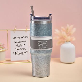 Κούπα καφέ με μόνωση Glitter 30oz, Διπλό στρώμα, Κούπα πάγου, Ανοξείδωτη κούπα αυτοκινήτου με καλαμάκι (Μπλε Ασημί)
