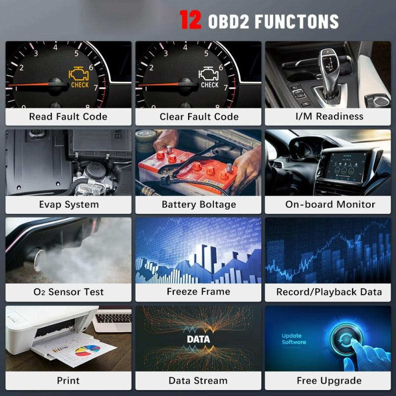 1. Ανάκτηση και διαγραφή κωδικών σφαλμάτων, ροή δεδομένων σε πραγματικό χρόνο σε μορφή κειμένου ή γραφήματος, έλεγχος ετοιμότητας I/M, εμφάνιση αποτελεσμάτων ελέγχου ενσωματωμένου παρακολουθητή, τάση μπαταρίας σε πραγματικό χρόνο, προβολή δεδομένων στιγμιότυπου, ενσωματωμένη βιβλιοθήκη κωδικών, έλεγχος αισθητήρα O2, έλεγχος συστήματος Evap, εγγραφή και αναπαραγωγή, ειδοποιήσεις LED, εκτύπωση δεδομένων, ανάκτηση πληροφοριών οχήματος (VIN, CIN και CVN).