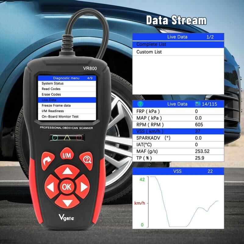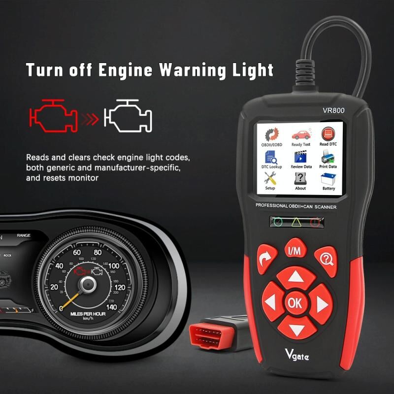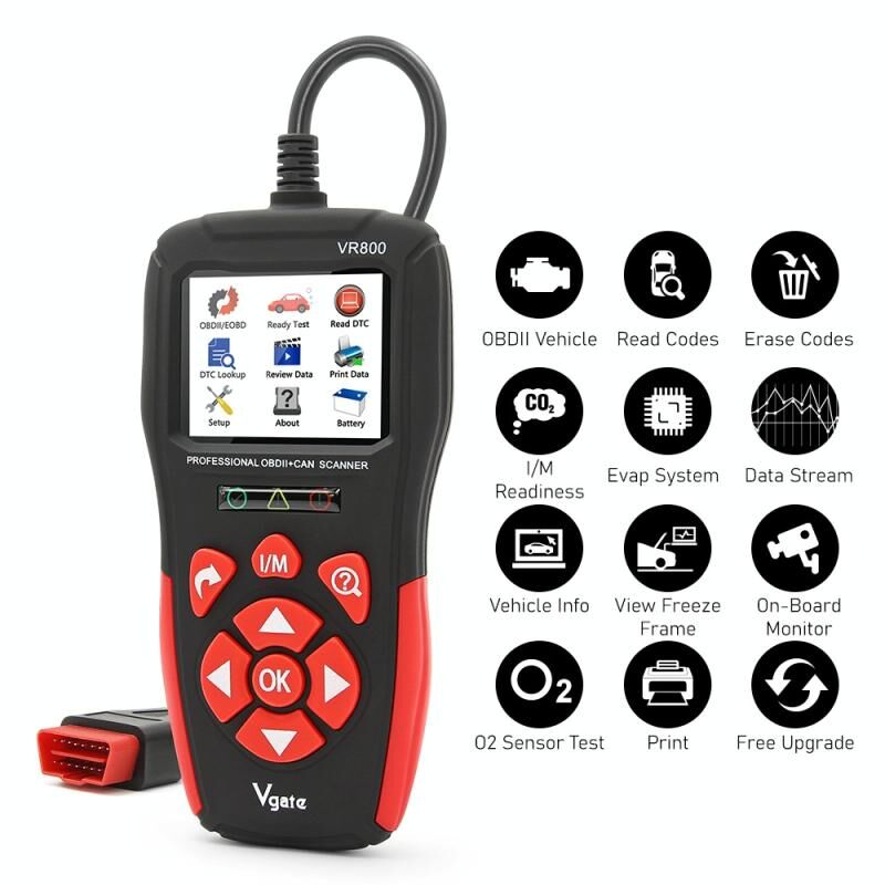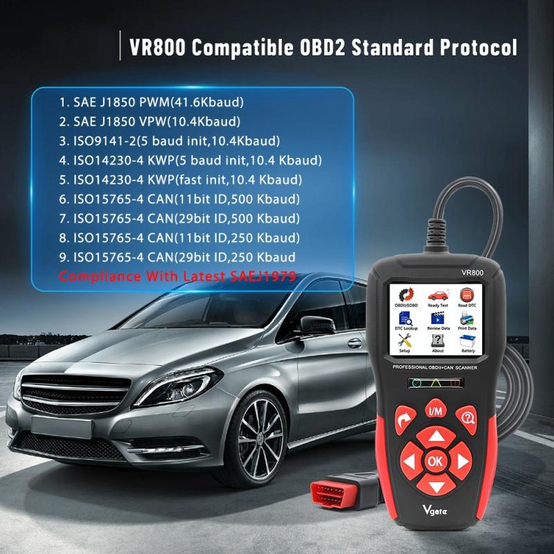 6. Σαρωτής Vgate VR800 OBD με νέες λειτουργίες όπως εμφάνιση κατάστασης μπαταρίας, βοήθεια DTC, γραφικά δεδομένα σε πραγματικό χρόνο, όλα τα πρωτόκολλα OBD-II και υποστηρίζει και τις 10 λειτουργίες δοκιμής OBD-II.