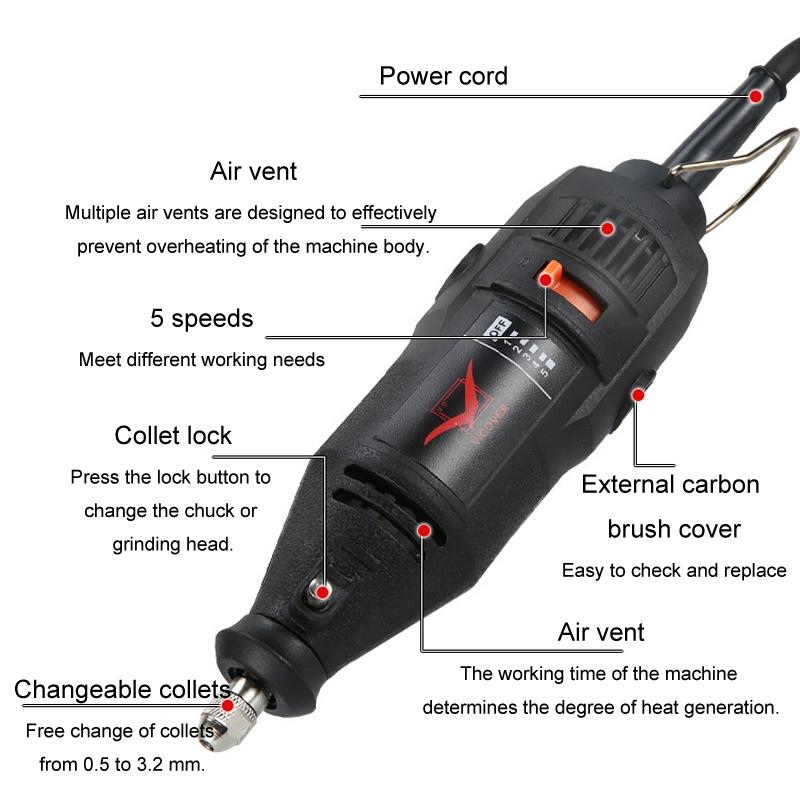 4. Freely replaceable collet, range of 0.5-3.2mm, external carbon brush cover, easy to check and replace