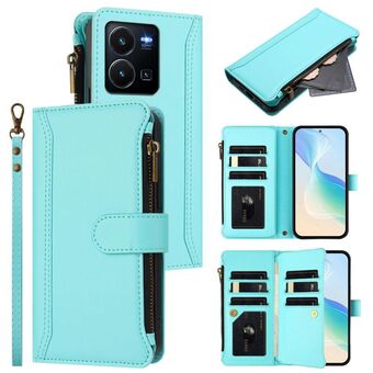 For vivo Y35 4G Global / Y77E 5G Magnetic Closure 9 Card Slots Zipper Leather Case with Hand Strap(Mint Green)