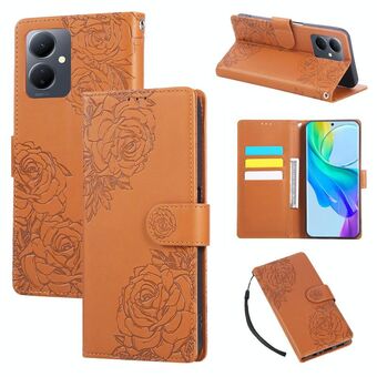 For vivo Y78 5G Global Rose Flower Embossed 3-Card Slots Leather Phone Case(Brown)