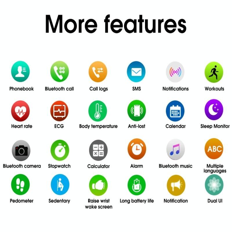 1. Highlights Functions: Support Bluetooth calling, Body temperature test, Heart Rate, BP & ECG、Steps, Fruit wath 5 Size, 44mm changeable band, Smart Beehive style menu, The nine box menu, IP68 waterproof