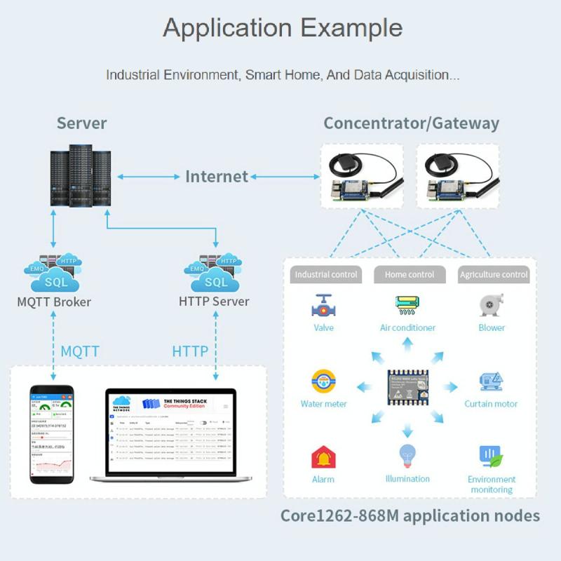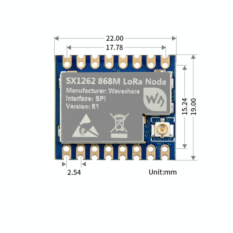 Το Core1262-868M είναι μια βασική μονάδα LoRa που ενσωματώνει το τσιπ νέας γενιάς SX1262. Διαθέτει χαρακτηριστικά όπως μικρό μέγεθος, μετάδοση μεγάλης εμβέλειας, υψηλή ικανότητα αντιμετώπισης παρεμβολών και πολλά άλλα. Η μονάδα χρησιμοποιεί τη ζώνη EU868, σε συνδυασμό με μια πύλη LoRa, μπορεί να συνδεθεί σε διακομιστές όπως ο διακομιστής TTN για να δημιουργήσει ένα δίκτυο LoRa.