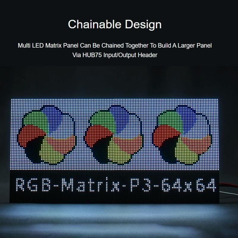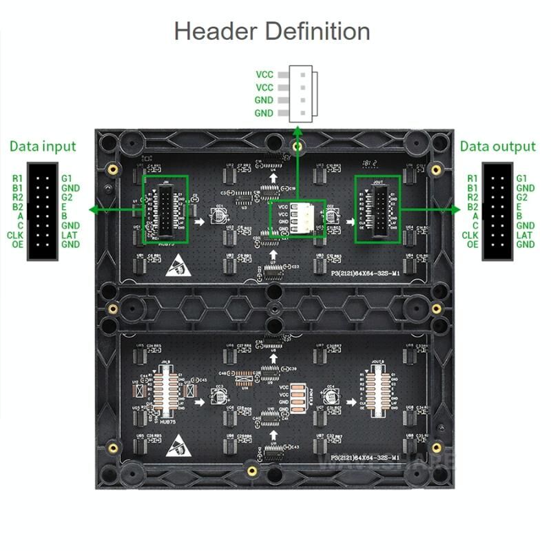 4. Ενσωματωμένες δύο κεφαλίδες HUB75, μία για είσοδο δεδομένων ελεγκτή, μία για έξοδο, υποστήριξη αλυσίδας