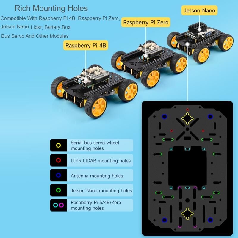 12. Abundant mounting holes, compatible with Raspberry Pi 4B, Raspberry Pi Zero, Jetson Nano, lidar, battery box, bus servo and other modules