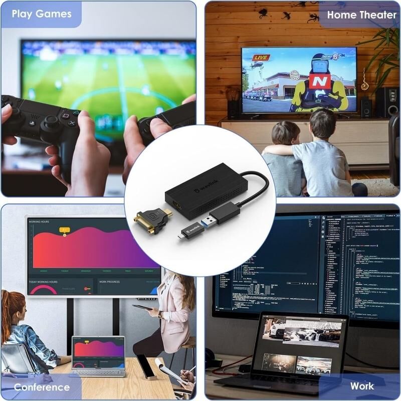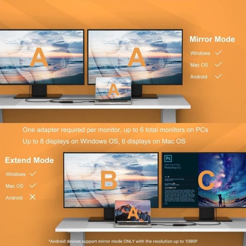 2.Supports up to 8 total monitors on Windows PCs, 6 displays on Mac OS. ( one display per adapter). Allows for effortless multitasking, mirror or extend a computer display works space,easy to install and use.