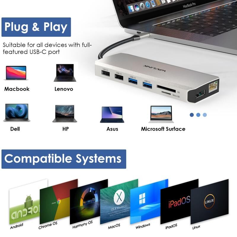 4. Αστραπιαίο δίκτυο Gigabit: Το WAVLINK triple display MST hub έχει μια αστραπιαία θύρα Gigabit Ethernet, που σημαίνει ότι μπορείτε να συνδεθείτε στο internet και να μεταφέρετε δεδομένα με ταχύτητα έως και 1000 Mbps, παρέχοντας σταθερή και αξιόπιστη απόδοση.