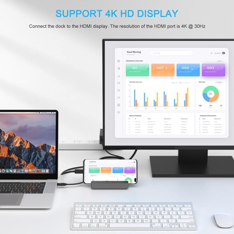 4. One Cable Connection: The dock delivers up to 36W of power via the Power over USB-C standard to charge USB-C laptops while adding HD and extended USB device connectivity, including 2 USB 3.0 Type-A ports, 1 USB 3.1 Gen2 USB-C ports and 1 USB 3.1 Gen1 USB-C port, all via a single USB-C cable (with built-in E-mark chip). The dock can charge your device even if your laptop is turned off or not connected at all