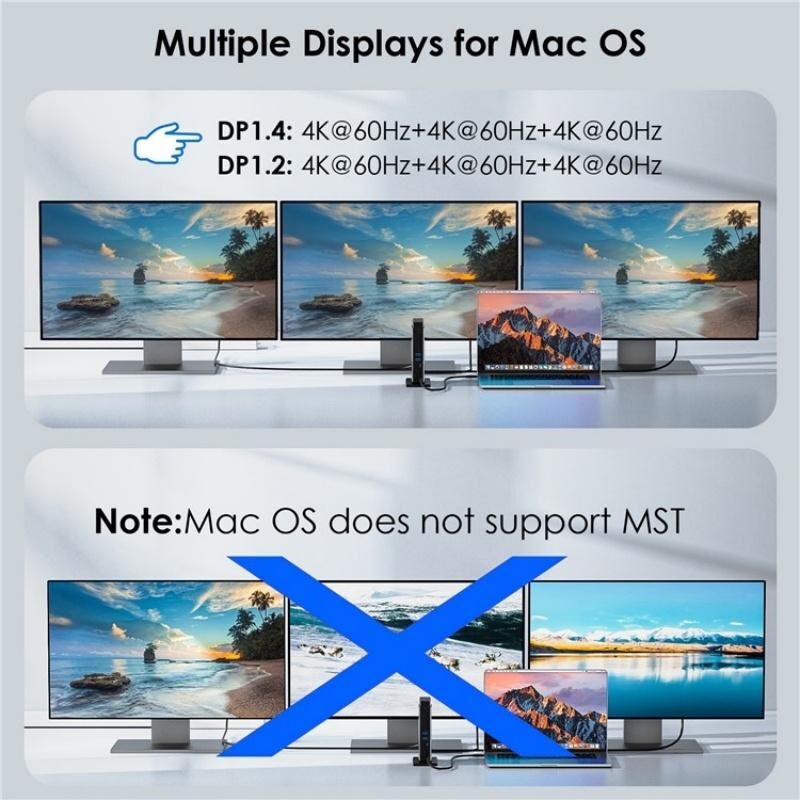 4. Plug-and-Play χωρίς την ανάγκη για εξωτερικούς οδηγούς: Οι Mac δεν υποστηρίζουν MST και μπορούν να επεκταθούν μόνο σε μία επιπλέον οθόνη (ABBB). Ορισμένοι φορητοί υπολογιστές ενδέχεται να υποστηρίζουν έως και τρεις οθόνες (συμπεριλαμβανομένης της οθόνης του κεντρικού υπολογιστή) λόγω περιορισμών της κάρτας γραφικών