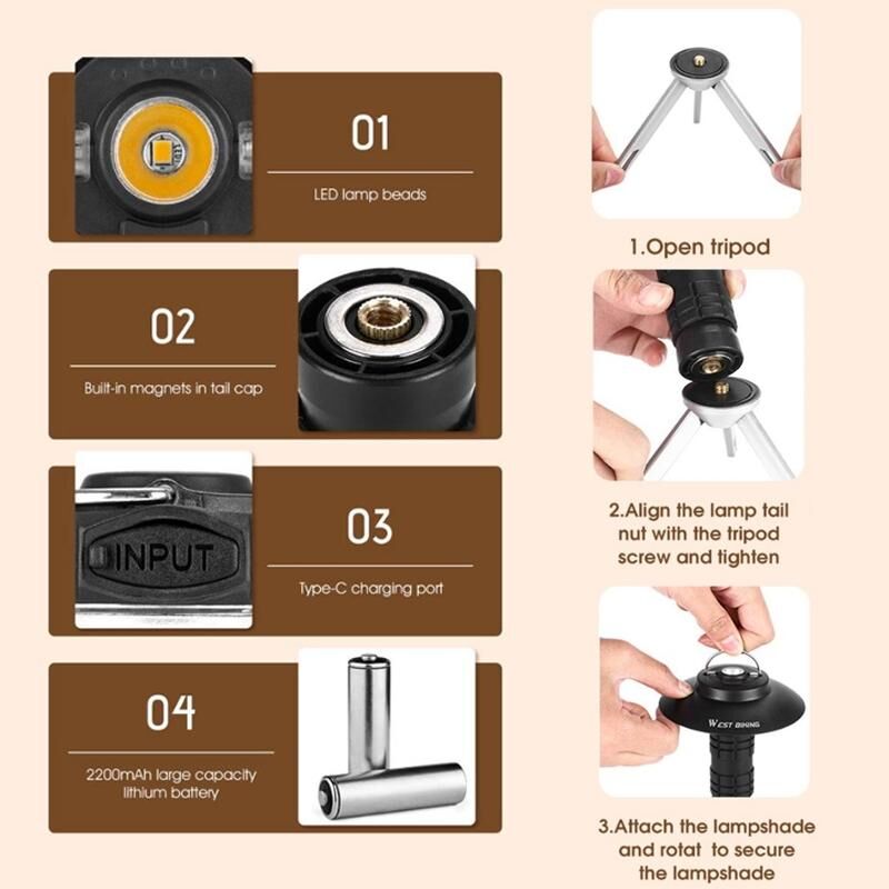 Φωτιστικό φανού για κάμπινγκ WEST BIKING, εξωτερικού χώρου, LED, φορητό, μαγνητικό, φακός έκτακτης ανάγκης (Μαύρο) (WEST BIKING)