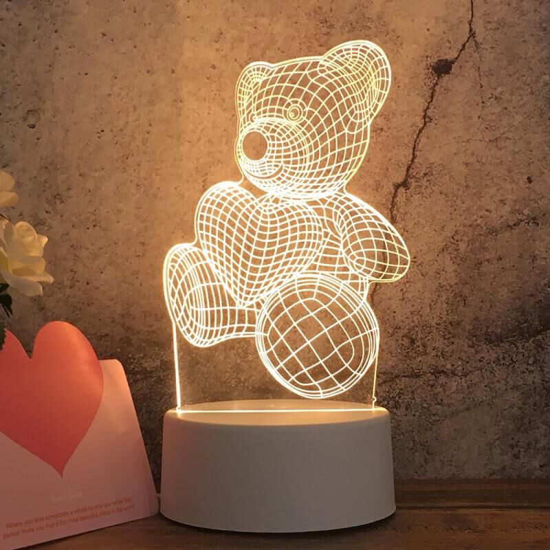 Λευκή Βάση Δημιουργικό 3D Τρίχρωμο Διακοσμητικό Νυχτερινό Φωτάκι LED, Έκδοση με Κουμπί και Βύσμα, Σχήμα: Αρκουδάκι Αγάπης (Λευκό-Ζεστό-Ζεστό Λευκό)
