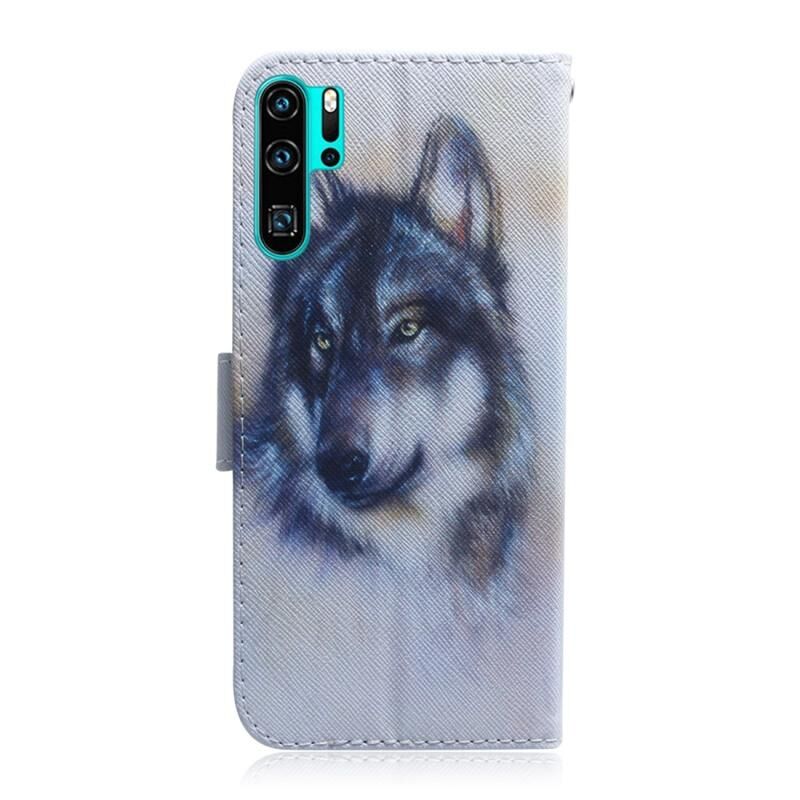 Θήκη δέρματος για Huawei P30 Pro με σχέδιο Λευκού Λύκου, οριζόντιο άνοιγμα, με βάση στήριξης, θήκες για κάρτες και πορτοφόλι.