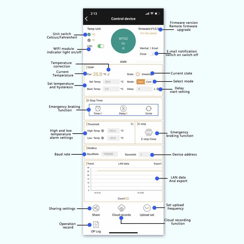 4. Με καταγραφές θερμοκρασίας στο cloud, ειδοποιήσεις WeChat, e-mail για ενέργειες διακοπής και τοπικούς ηχητικούς συναγερμούς