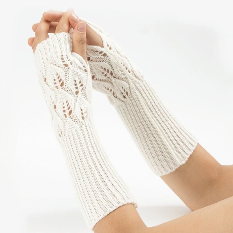 Χειμώνας άνδρες και γυναίκες πλεκτά Jacquard φύλλα ποδηλασίας Ζεστά γάντια από μαλλί χωρίς δάχτυλα (λευκό)