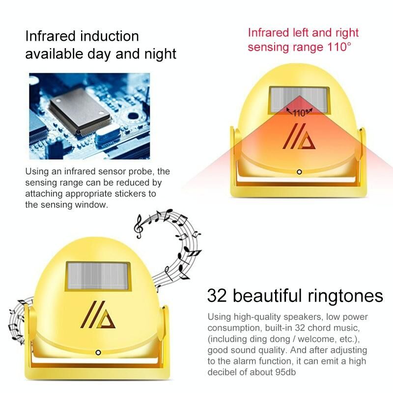 3 modes: Voice Alarm Music,at "Voice" mode: Human voice,dingdong,ninhao,huan ying guang ling;at "Alarm"mode: keeps you aware of intruders;at "Music" mode: just as a doorbell,with 32 music to welcome your guests