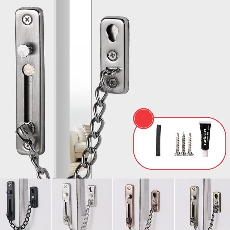 2. Press the safety button to open the chain, preventing outsiders from reaching inside and hooking down the chain to open the lock