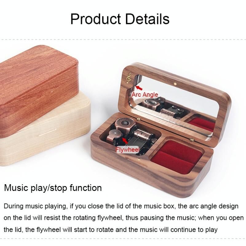 5. Λειτουργία αναπαραγωγής/διακοπής μουσικής: Κατά τη διάρκεια της αναπαραγωγής μουσικής, αν κλείσετε το καπάκι του μουσικού κουτιού, ο σχεδιασμός γωνίας τόξου στο καπάκι θα αντισταθεί στον περιστρεφόμενο σφόνδυλο, διακόπτοντας έτσι τη μουσική, όταν ανοίξετε το καπάκι, ο σφόνδυλος αρχίζει να περιστρέφεται, η μουσική συνεχίζει να παίζει