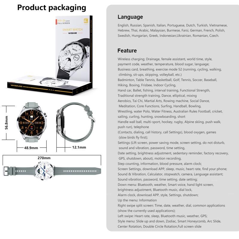 15. Κύρια λειτουργία: Παρακολούθηση υγείας, βοηθός γυναικών, παγκόσμια ώρα, στυλ· κωδικός πληρωμής, καιρός, θερμοκρασία σώματος, σάκχαρο αίματος, γλώσσα· επαγγελματική κάρτα, αναπνοή, 52 αθλητικές λειτουργίες (τρέξιμο, ποδηλασία, περπάτημα, πεζοπορία, κοιλιακοί, σχοινάκι, βόλεϊ, μπάντμιντον, επιτραπέζια αντισφαίριση, μπάσκετ, γκολφ, τένις, ποδόσφαιρο, μπέιζμπολ, πεζοπορία, πυγμαχία, εσωτερική ποδηλασία, χειροκίνητο αυτοκίνητο, μπαλέτο, ψάρεμα, διαλειμματική προπόνηση, λειτουργική δύναμη, παραδοσιακή προπόνηση δύναμης, χορός, ελλειπτικό μηχάνημα, μικτή αερόβια, τάι τσι, πολεμικές τέχνες, κωπηλατική μηχανή, κοινωνικός χορός, διαλογισμός, βασική λειτουργία, σέρφινγκ, χάντμπολ, μπόουλινγκ, πάλη, υδατοπόλο, υδάτινη γυμναστική, αυστραλιανό ποδόσφαιρο, κρίκετ, ιστιοπλοΐα, κάρλινγκ, κυνήγι, σνόουμπορντ, σφαιρίδιο τοίχου με κοντή λαβή, αθλήματα πολλαπλών γεγονότων, χόκεϊ επί χόρτου, ράγκμπι, αλπικό σκι, νορδική πεζοπορία, γρήγορο περπάτημα), τηλέφωνο (επαφές, κλήση, αρχείο κλήσεων, ρυθμίσεις κλήσεων), οξυγόνο αίματος, παιχνίδι (Flappy Bird)· ρυθμίσεις (ύψωση χεριού για φωτισμό οθόνης, λειτουργία εξοικονόμησης ενέργειας, ρυθμίσεις οθόνης, μην διαταράσσετε, ήχος και δόνηση, κωδικός πρόσβασης, ρυθμίσεις ώρας, ρυθμίσεις ημερομηνίας, ρύθμιση φωτεινότητας, υπενθύμιση καθιστικής ζωής, επαναφορά εργοστασίου, GPS, τερματισμός λειτουργίας, πληροφορίες), αρχείο άσκησης, βηματομετρητής, μηνύματα, πίεση αίματος, ξυπνητήρι· ρυθμίσεις οθόνης, λήψη εφαρμογής, ύπνος, μουσική, καρδιακός ρυθμός, εύρεση τηλεφώνου· ήχος και δόνηση, αριθμομηχανή, χρονόμετρο, κάμερα, γλωσσικός βοηθός· ήχος δόνησης, κωδικός πρόσβασης, ρυθμίσεις ώρας, ρυθμίσεις ημερομηνίας.
