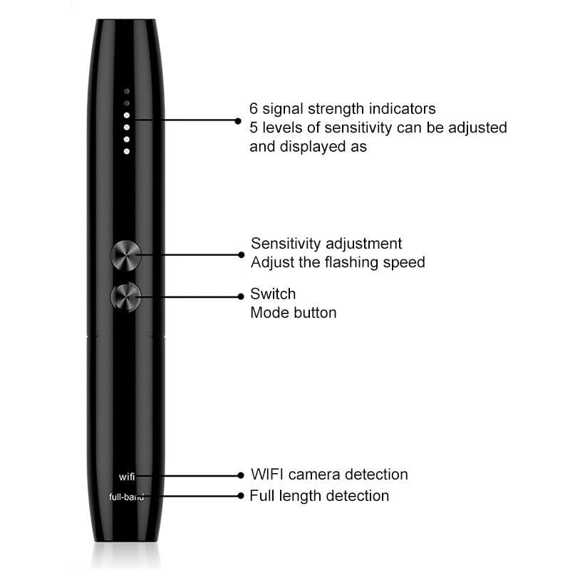 5. Laser detection: You can see through the host window, all the camera lenses in the line of sight. It can wirelessly sweep:frequency detection range(1MHZ-6.5GHZ). Low voltage prompt function, built-in rechargeable battery.