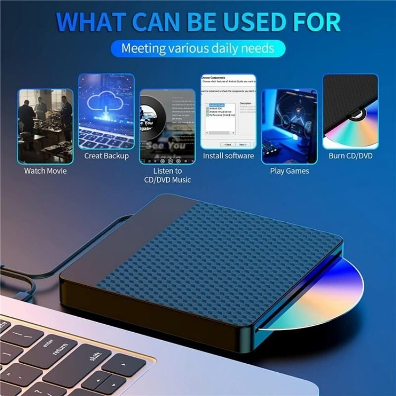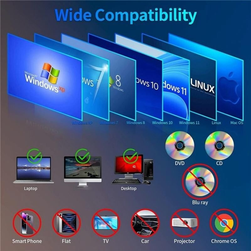 7. Compatible with optical discs ranging from 8 to 12cm and supports formats including DVD-ROM, DVD-R, DVD+R, DVD-RW, DVD-R DL, CDA, CD-ROM, CD-R, VCD, SVCD, and CD-RW