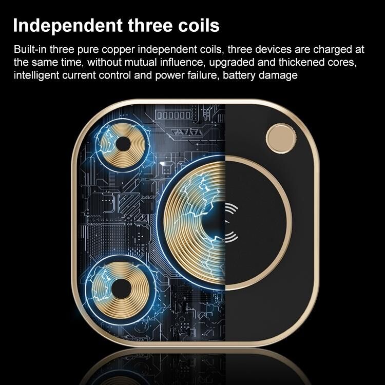 3. Έξυπνο τσιπ αναγνώρισης, αναγνωρίζει αυτόματα τις διαφορετικές αρχιτεκτονικές φόρτισης κινητών τηλεφώνων για να παρέχει κατάλληλο ρεύμα, η φόρτιση υψηλής απόδοσης γίνεται επίσης ένα βήμα πιο γρήγορα! Τρεις συσκευές συγχρονίζουν την ασύρματη παροχή ρεύματος, η φόρτιση δεν περιμένει.