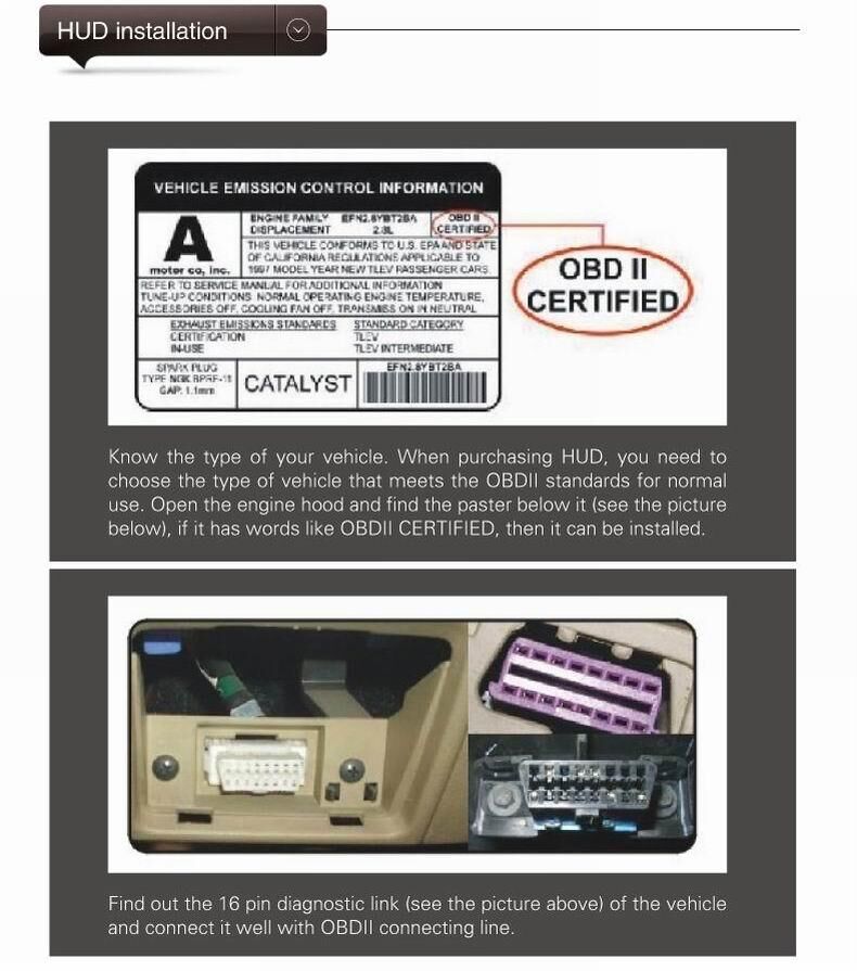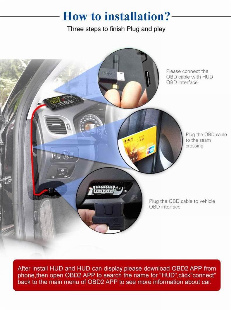 1. Plug and play. HUD can automatically adapt to vehicle type which in line with OBDII or EUOBD(On-Board Diagnostic System).