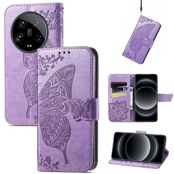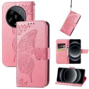 Θήκη τηλεφώνου από δέρμα με ανάγλυφο σχέδιο πεταλούδας και λουλουδιών για Xiaomi 14 Ultra (Ροζ)