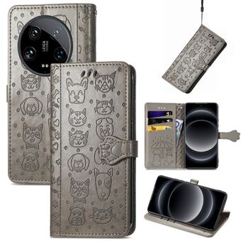 Θήκη τηλεφώνου από δέρμα με ανάγλυφο σχέδιο γάτας και σκύλου για Xiaomi 14 Ultra (Γκρι)