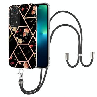 For Xiaomi Redmi Note 11S/Note 11 4G Foreign Splicing Marble Flower Pattern TPU Phone Case with Lanyard(Black Flower)