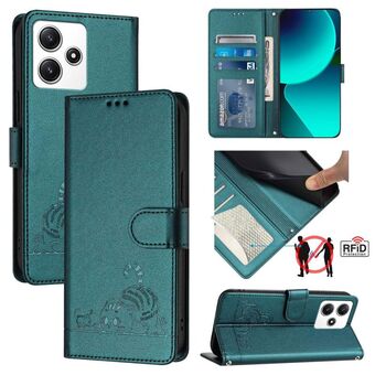 For Xiaomi Redmi 12 5G Global Cat Rat Embossed Pattern RFID PU Phone Case with Wrist Strap(Peacock Green)