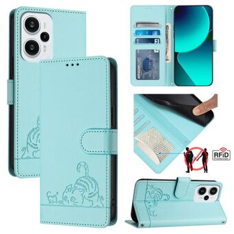 For Xiaomi POCO F5 Cat Rat Embossed Pattern RFID PU Phone Case with Wrist Strap(Mint Green)
