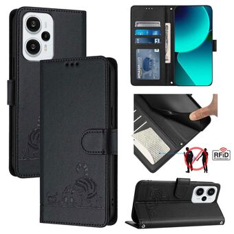 For Xiaomi POCO F5 Cat Rat Embossed Pattern RFID PU Phone Case with Wrist Strap(Black)