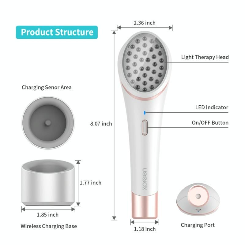 4. Η ενσωματωμένη επαναφορτιζόμενη μπαταρία επιτρέπει την ασύρματη και ελεύθερη χρήση. Όταν η μπαταρία είναι χαμηλή, απλά τοποθετήστε τη συσκευή φωτοθεραπείας στην ασύρματη βάση φόρτισης για να ξεκινήσει αμέσως η φόρτιση.
