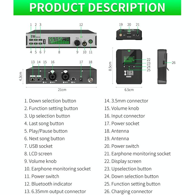 1. Αυτή η συσκευή είναι ένα ασύρματο σύστημα in-ear monitor που χρησιμοποιείται σε σκηνικές παραστάσεις και ηχογραφήσεις. Μπορεί να αντικαταστήσει τις παραδοσιακές πολύπλοκες συσκευές παρακολούθησης ήχου και να επιτύχει ένα εξαιρετικό αποτέλεσμα παρακολούθησης.