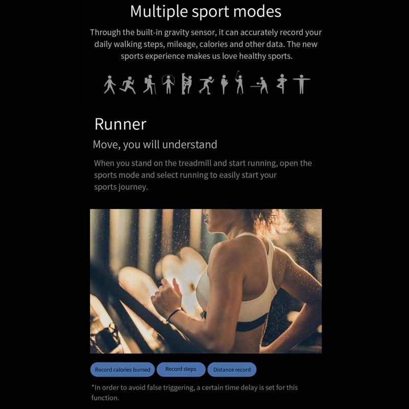 15. Functions: date/week display, weather forecast, battery display, step counting, heart rate, blood pressure, blood oxygen, distance, calories, automatic sleep monitoring, support for making and connecting calls (call function), body temperature monitoring, compatible VC32 true blood oxygen, real-time heart rate detection, heart rate alarm, multi-sport modes (running, skipping rope, cycling, table tennis, badminton, walking, mountaineering, basketball, soccer, jumping, elliptical machine, yoga, swimming), fitness Information sharing, exercise goal setting, GPS exercise, running, walking, cycling GPS track, history record, exercise track sharing, calories, distance, pace display, call reminder, contact reminder, message reminder, alarm clock reminder, message Push, Do Not Disturb, Password Lock, Stopwatch, Women's Health Reminder, etc.